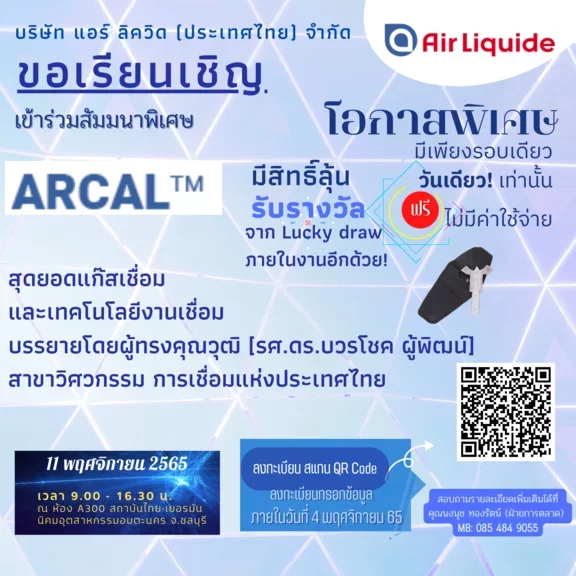 วิทยากร : บรรยาย โดย รศ.ดร บวรโชค ผู้พัฒน์ วิทยากร ระดับแนวหน้าของประเทศไทย และ ระดับนานาชาติ รวมทั้งมีการสาธิตการเชื่อมจริงโดยช่างเชื่อมมืออาชีพ
